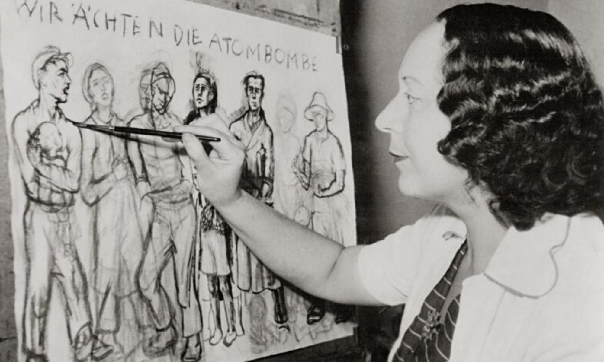 Bild Bundesarchiv 183-R88551 | Originalbildunterschrift vom August 1950: „Die Dresdner Malerin Lea Grundig wurde zum Nationalkongreß (25. – 26.8.50 in Berlin) delegiert. Die Künstlerin bei einer Arbeit zur Ächtung der Atombombe.“